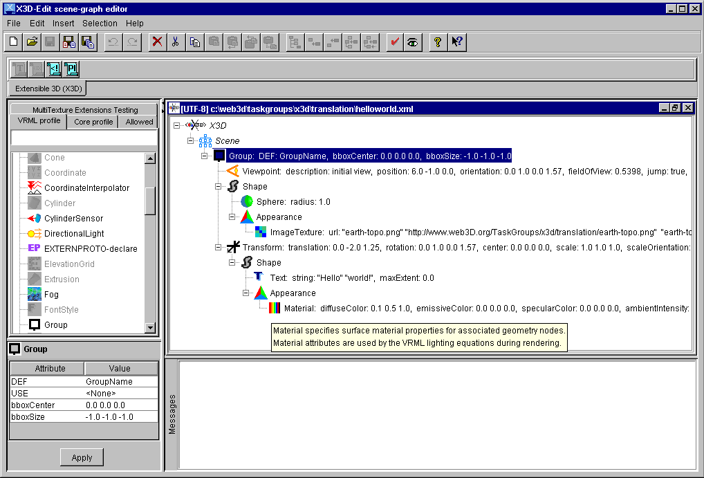 For additional help information about X3D scenes, please see X3D Tooltips, X3D Resources, and X3D Scene Authoring Hints.