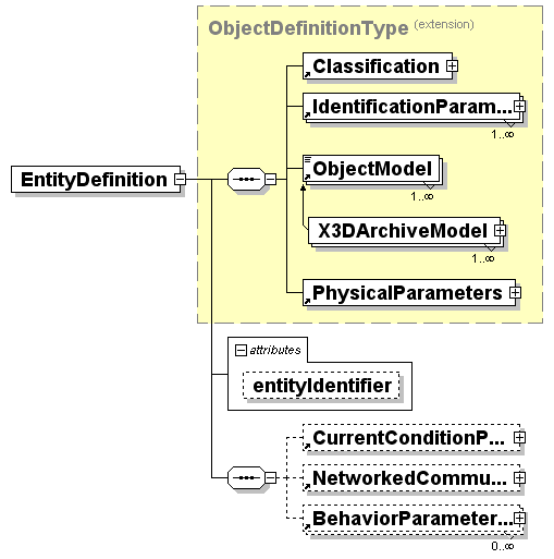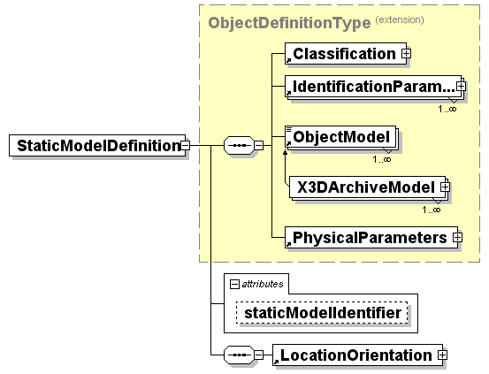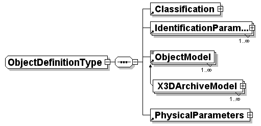 | source | <xs:complexType name="ObjectDefinitionType"> <xs:annotation> <xs:appinfo>Super-type which contains the base elements for all non-terrain models, including identification, 3D model, and physical parameters.</xs:appinfo> </xs:annotation> <xs:complexContent> <xs:extension base="FullyExtensibleSMALElementType"> <xs:sequence> <xs:element ref="Classification"/> <xs:element ref="IdentificationParameters" maxOccurs="unbounded"/> <xs:element ref="ObjectModel" maxOccurs="unbounded"/> <xs:element ref="PhysicalParameters"/> </xs:sequence> </xs:extension> </xs:complexContent> </xs:complexType> |
