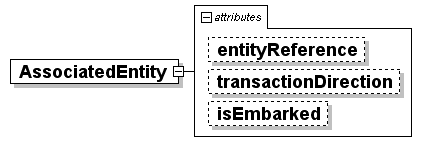 | source | <xs:element name="AssociatedEntity"> <xs:complexType> <xs:complexContent> <xs:extension base="FullyExtensibleSMALElementType"> <xs:attribute name="entityReference" type="xs:IDREF"/> <xs:attribute name="transactionDirection" type="transactionDirectionEnumeration"/> <xs:attribute name="isEmbarked" type="xs:boolean"/> </xs:extension> </xs:complexContent> </xs:complexType> </xs:element> |