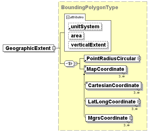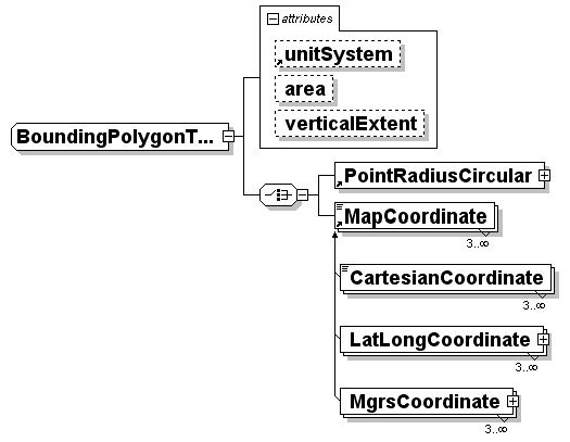 | source | <xs:complexType name="BoundingPolygonType"> <xs:annotation> <xs:appinfo>A base complexType used to describe a two-and-a-half dimensional shape for the purposes of establishing boundaries. Description of the shape is either by defining the points of a polygon or by establishing a centerpoint and radius for a circular boundary.</xs:appinfo> </xs:annotation> <xs:complexContent> <xs:extension base="FullyExtensibleSMALElementType"> <xs:choice> <xs:element ref="PointRadiusCircular"/> <xs:element ref="MapCoordinate" minOccurs="3" maxOccurs="unbounded"/> </xs:choice> <xs:attribute ref="unitSystem"/> <xs:attribute name="area" type="xs:float" use="optional" default="0.0"/> <xs:attribute name="verticalExtent" type="xs:float" use="optional" default="0.0"/> </xs:extension> </xs:complexContent> </xs:complexType> |