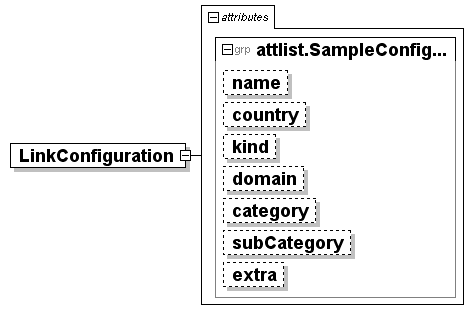 | source | <xs:attributeGroup name="attlist.SampleConfigurationParameters"> <xs:attribute name="name" type="xs:NMTOKEN"/> <xs:attribute name="country" type="xs:NMTOKEN"/> <xs:attribute name="kind" type="xs:NMTOKEN"/> <xs:attribute name="domain" type="xs:NMTOKEN"/> <xs:attribute name="category" type="xs:NMTOKEN"/> <xs:attribute name="subCategory" type="xs:NMTOKEN"/> <xs:attribute name="extra" type="xs:NMTOKEN"/> </xs:attributeGroup> |