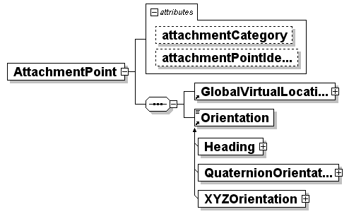 | source | <xs:element name="AttachmentPoint"> <xs:annotation> <xs:appinfo>Allows the attachment to this unit of independently operating entities by type and location. This AttachmentPoint can be uniquely identified using the attachmentPointIdentifier attribute.</xs:appinfo> </xs:annotation> <xs:complexType> <xs:complexContent> <xs:extension base="FullyExtensibleSMALElementType"> <xs:sequence> <xs:annotation> <xs:appinfo>The GlobalVirtualLocation is used to modify the position of the AttachmentPoint from the origin of the object to which it belongs.</xs:appinfo> <xs:appinfo>The Orientation element is used to modify the orientation of the AttachmentPoint from the orientation of the object to which it belongs.</xs:appinfo> </xs:annotation> <xs:element ref="GlobalVirtualLocation"/> <xs:element ref="Orientation"/> </xs:sequence> <xs:attribute name="attachmentCategory" type="attachmentCategoryEnumeration"/> <xs:attribute name="attachmentPointIdentifier" type="xs:ID"/> </xs:extension> </xs:complexContent> </xs:complexType> </xs:element> |