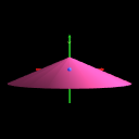 Flattened Cone: a cone with a large bottom radius and a short height, with coordinate axes superimposed to show X3D/VRML directions |