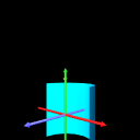 Figure 15.08 Extruded Half Cylinder With Caps With Axes | An extruded half cylinder built using half of a circular cross section swept along a straight spine. Also see Figure 15.9 for comparison. |