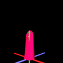 Figure 15.16 Extruded Lipstick With Axes | A lipstick shape created by rotating a circular cross section about the X axis as it is extruded. |