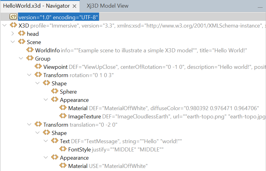 34            <WorldInfo info='"Example scene to illustrate a simple X3D model"title='Hello World!'/>